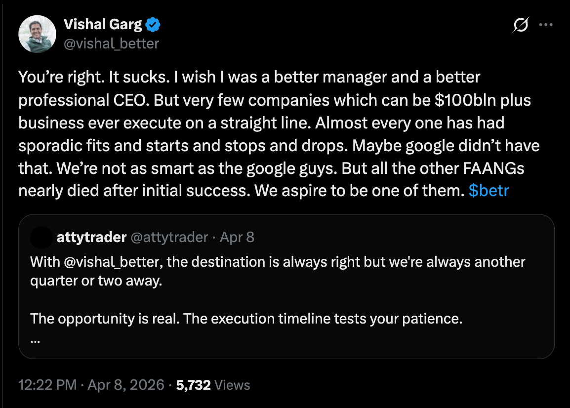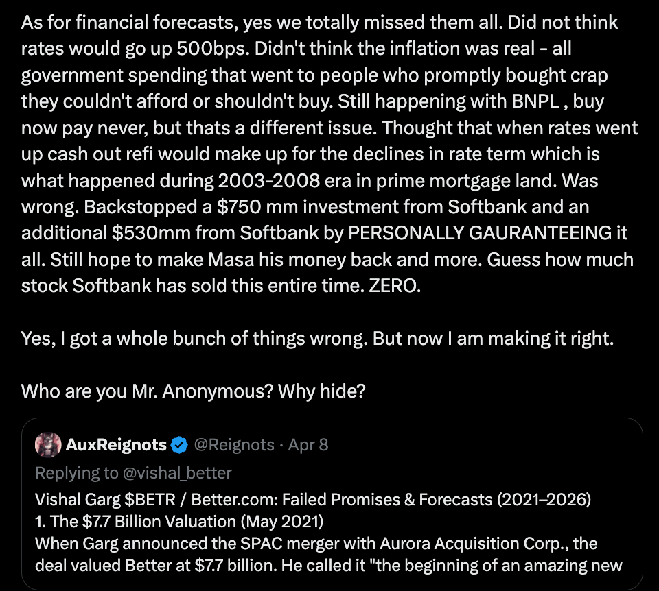 Better founder & CEO Vishal Garg is raising some eyebrows by getting into online fights w/ anonymous people on Twitter (no, I won’t call it ‘X’) as Better’s stock experiences volatility. In one example, Garg scolded X user “Reignots” for bringing up the Sarah Pierce case (it was dropped), the SEC investigation (charges were never filed), but admitted to being way off the mark on past financial projections.