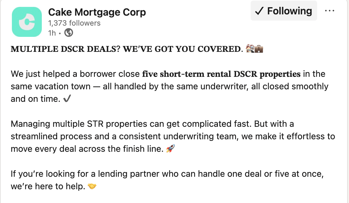 Cake, which was founded in 2018 by a former professional video gamer 🎮️ , is focused on non-QM, hard money loans & turndowns from other lenders. One observer noted that at FUSE, several members of their booth had been in the mortgage game less than a year. Cake didn’t respond to a request for comment. But it did post this on LinkedIn on Monday 👇