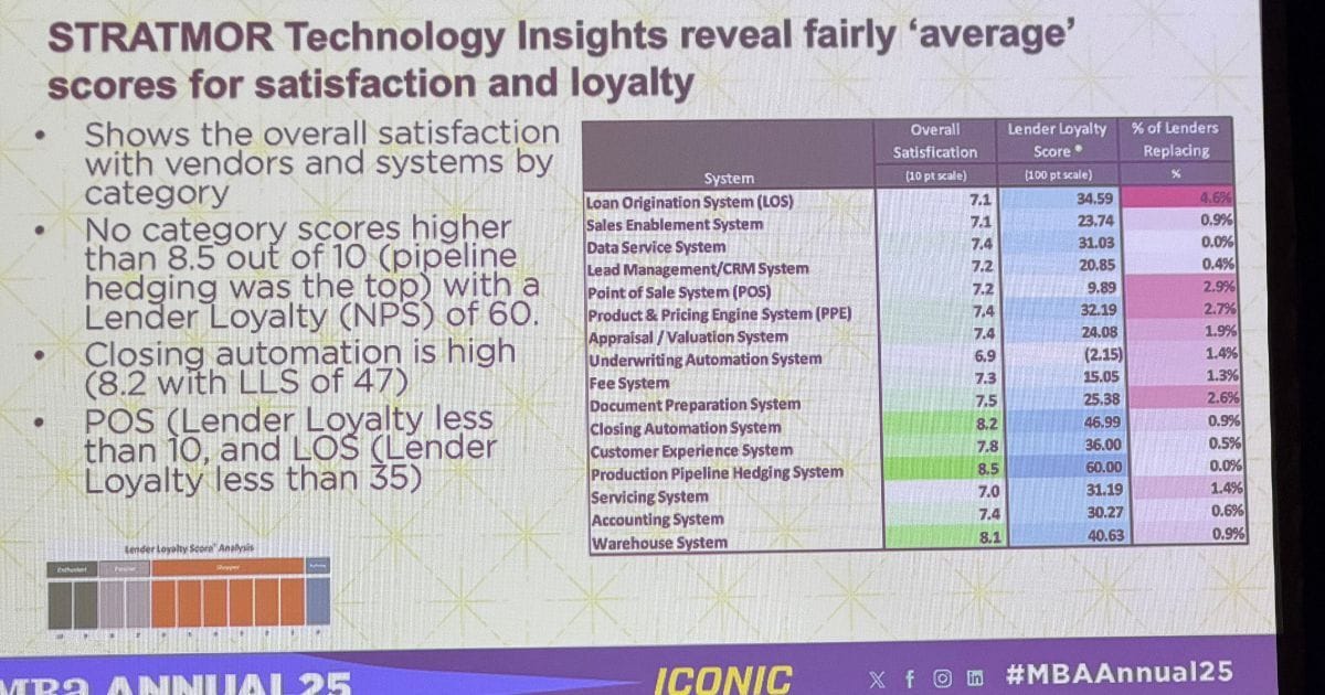 “Lenders do not have a significantly high level of satisfaction w/ the vendor stack,” said STRATMOR’s Garth Graham at MBA Annual on Wednesday. The survey contained more than 20 vendor tech stacks & per Graham, it’s all rather complicated. For example: Sometimes a low score for the POS is actually the fault of a poor integration w/ the LOS & PPE.